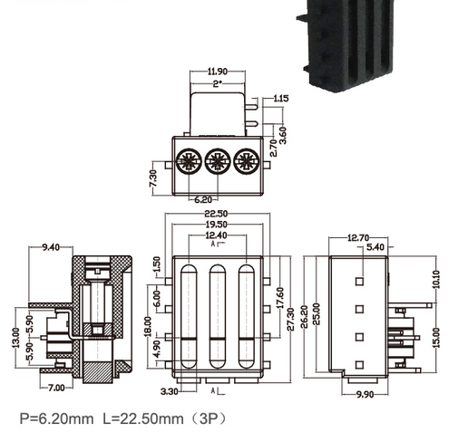 Pitch 6.2mm PCB Terminal Block Brass 300V 15A 3 Poles PA66 UL94-V0